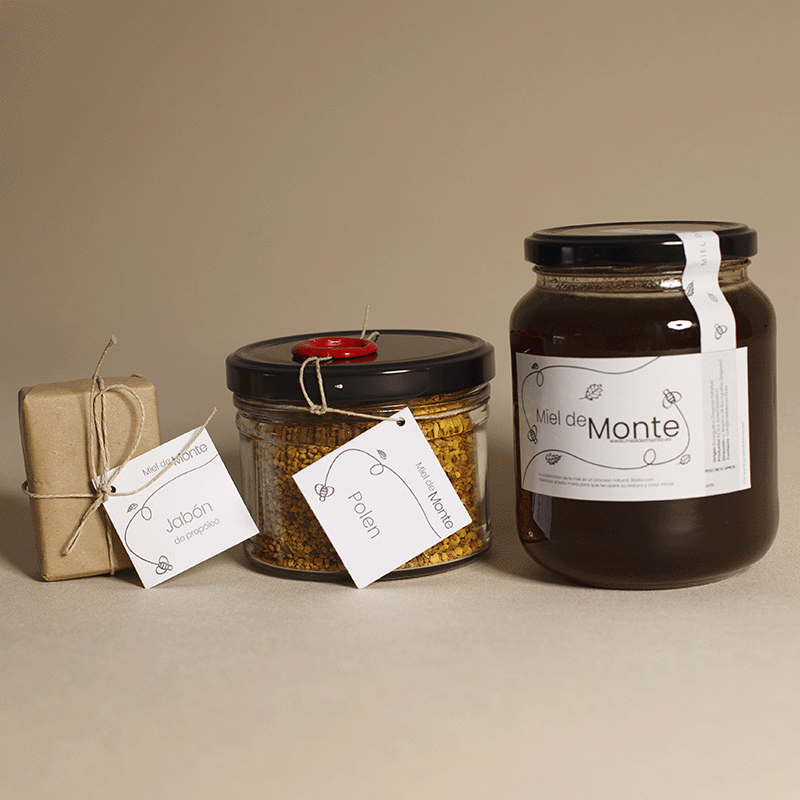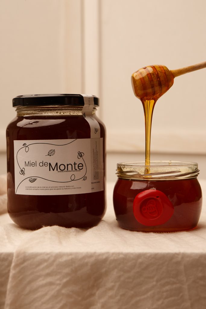 La Miel de Monte es un producto de origen natural con propiedades adquiridas gracias a la diversidad de flora donde las abejas han recolectado néctar. El origen de éste puede estar en flores como el cantueso, majuelo, tomillo, zarza… o en los robles y encinas, que en los meses de verano eliminan el exceso de savia, rica en azúcares, hacia el exterior, segregando una sustancia azucarada, el mielato, que es recogido por nuestras abejas.